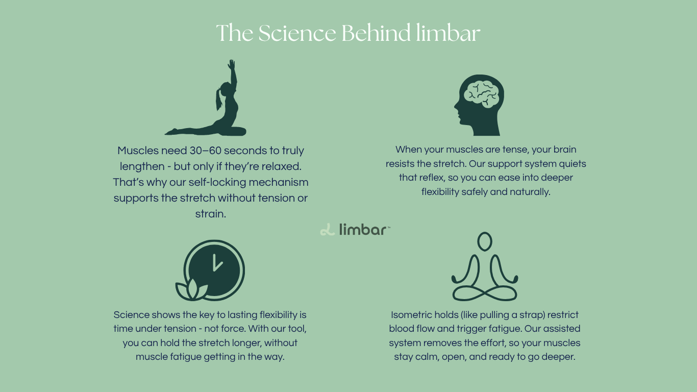 limbar isn't a one trick pony. It's designed to unlock you to a new depth in multiple poses for multiple muscles - safely, smoothly, and at your own pace.